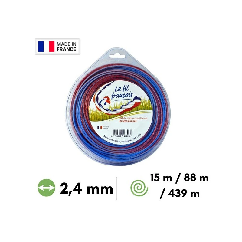 Découvrez ce nouveau fil de coupe tri-composants qui résulte d’un savoir-faire unique français. Ce fil tricolore à l’effigie de la France est constitué de polyamides de qualité supérieure. Avec son profil hélicoïdal, il se distingue grâce une stabilité élevée, une coupe nette mais aussi silencieuse ! Son profil lui permet de moins chauffer lors de l’utilisation de votre débroussailleuse / coupe-bordures, cela évite donc la casse au niveau de l’œillet. La longévité est donc optimale.
